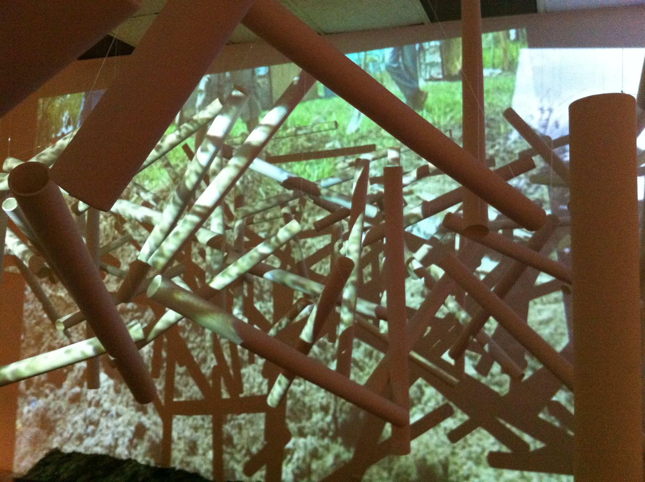 museum itself. For now/here, they play video recordings of random interviews about the Lopez Museum conducted within a 1 kilometer radius of the past, present, and future museum sites. By the entrance to their exhibit space, the artists recreated a Manansala mural that had been demolished when the old museum in Pasay was torn down. To enter into their space, one crosses a short wooden bridge. This symbolizes the transition from the “old” museum to its current site. The bridge crosses over a stylized excavation site filled with mud that had actually been transported from the museum’s original location.